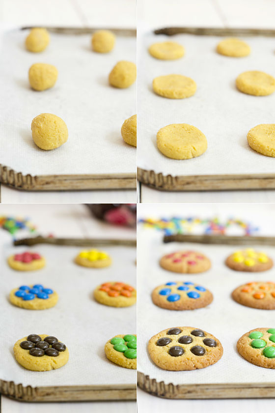 Una vez conseguida la masa la dividimos en varias porciones y hacemos bolitas con cada una de ellas y las depositamos en bandejas. Con la palma de la mano aplastamos esas bolitas y colocamos los lacasitos o M&M que queremos en cada una de ellas. Luego se hornean unos 10 o 12 minutos con calor arriba y abajo para que se hagan bien y ya está, listas para comer!