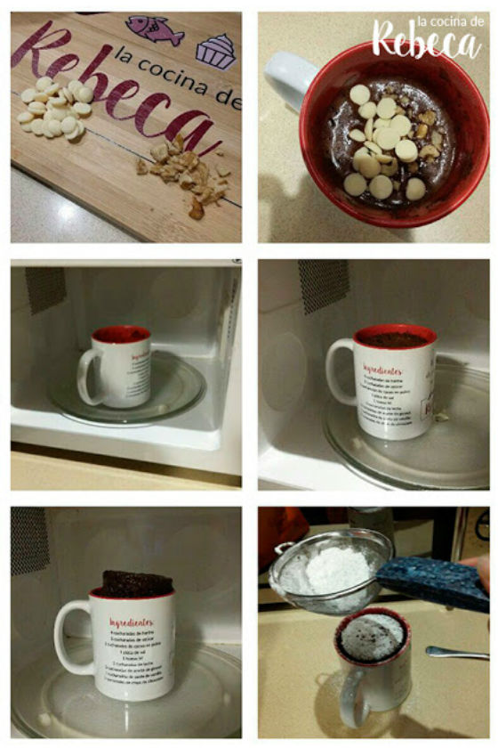 Se pone en un recipiente (en una taza en este caso) la harina, el cacao, el azúcar y la sal y se remueve. Luego se añade el huevo y se vuelve a mezclar todo. Por último se incorpora el aceite y la leche y se vuelve a remover. Una vez hecho esto le puedes añadir a mayores los ingredientes que tú quieras.