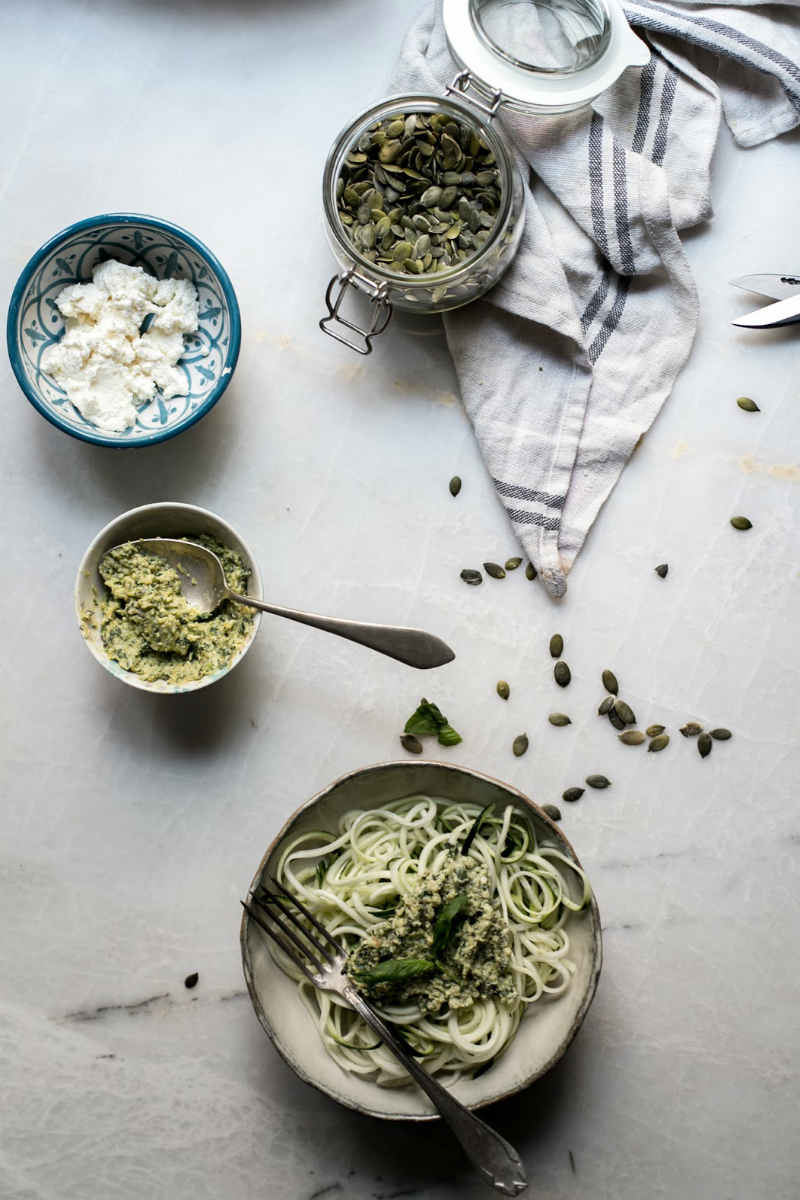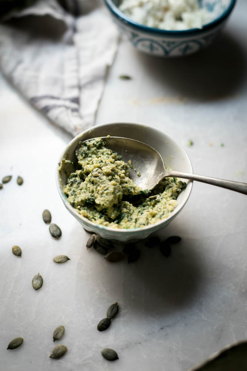 Ahora, añadimos en la trituradora con la pasta de almendras anterior el queso, las semillas de calabaza, el zumo de lima, la albahaca, el agua, el aceite, la sal y la pimienta. A continuación, trituramos todo a velocidad progresiva (de menos velocidad a más) hasta conseguir la consistencia que deseamos.