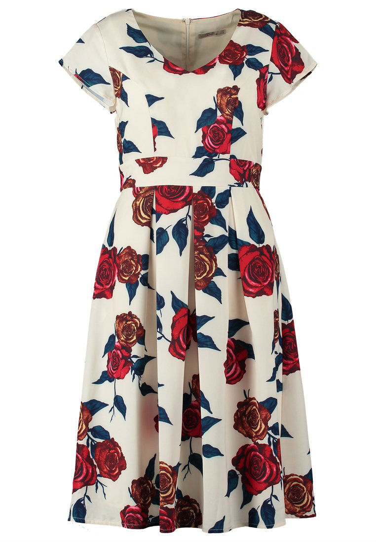 Los años 50 vuelven de la mano de este vestido con print floral sobre base en color crema de Zalando. El vuelo de la falda te aportará comodidad mientras que la parte superior se ajustará a tu cuerpo para mostrar las curvas más bonitas de tu anatomía.
