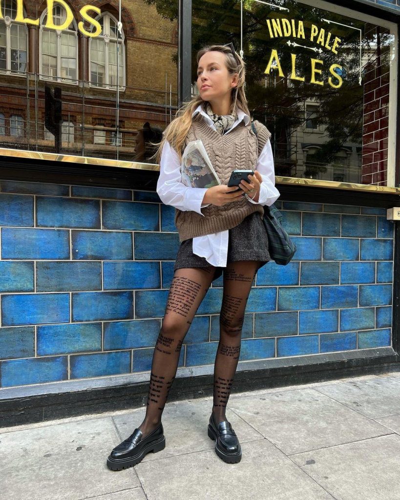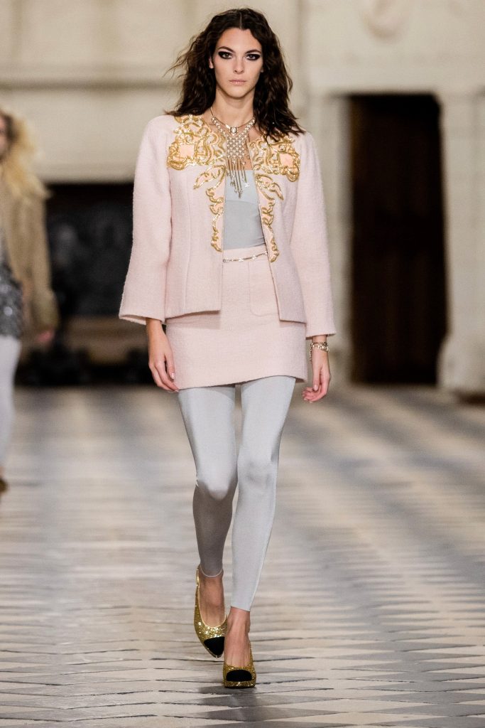 Lo vimos en la colección otoño/invierno de Chanel, aunque con un aspecto totalmente diferente al que solíamos conocer de esta inusual combinación. Atrás quedaron las faldas vaqueras con leggins de colores debajo. En esta ocasión, Virginie Viard opta por un ‘twin set’ de tweed, sello de la casa, junto a unos leggins plateados del mismo color que el top, lo que crea un efecto visual de mono y consigue alargar la figura.
