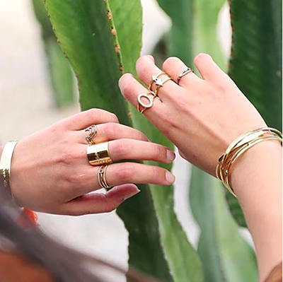 Anillos simples, con piedras de algún color a elegir, figuras geométricas como gotas o flechas, anillos dobles y otros que puedes combinar varios en un mismo dedo.
