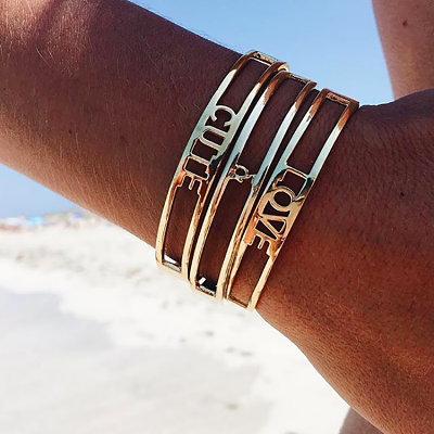 Los brazaletes también son una buena opción para lucirlos a modo de pulsera o en el brazo. La última apuesta de María Pascual ha sido introducir en ellos palabras con las que puedes crear mensajes.