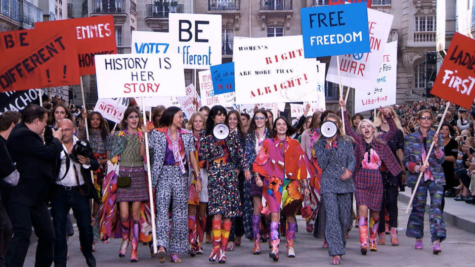 La puesta en escena del desfile de Chanel primavera verano 2015 fue de lo más prometedor. Las modelos Cara Delevingne, Gisele Bündchen, Georgia May Jagger y Kendall Jenner simularon una manifestación a favor de la mujer, acompañadas por pancartas y megáfonos. Cara Delevingne se convirtió en la voz cantante de la colección Prêt-à-Porter de la maison, “la historia es su hitoria y los derechos de las mujeres son más que buenos. Sé libre”, afirmaba.