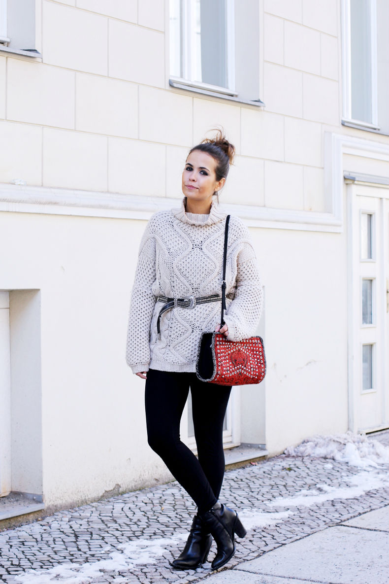 Durante el día a día solemos escoger bolsos de tamaño más grandedonde cabe todo lo que alguien se pueda llegar a imaginar. Collage Vintage, una de las bloggers más conocidas de nuestro país, luce un bolso rojo con tachuelas que aporta vitalidad a su conjunto básico.