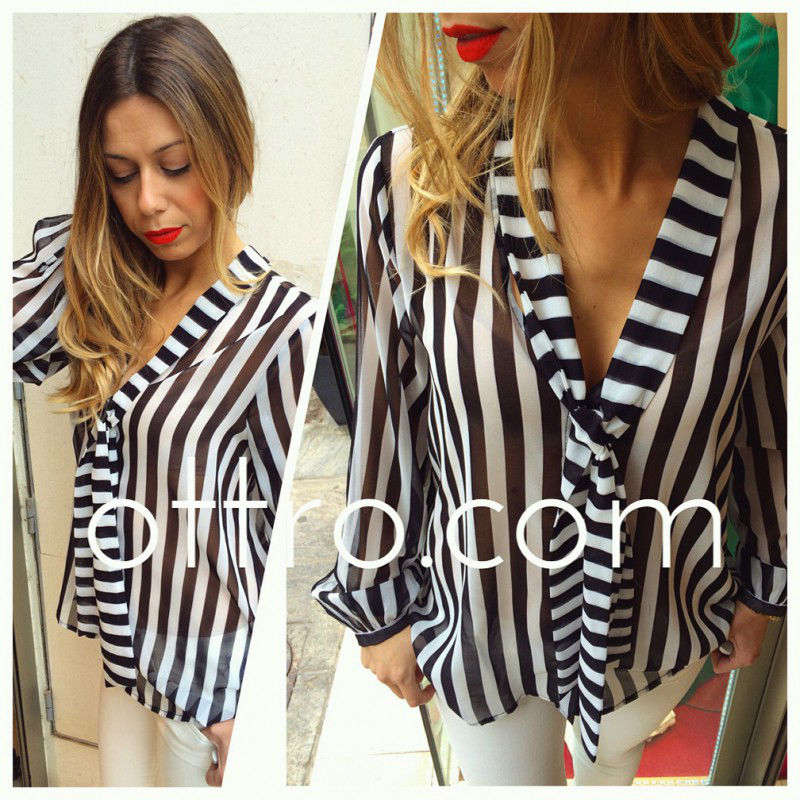 Las camisas siempre nos sacan de los mayores apuros estilísticos y esta lo hará en más de una ocasión. Las múltiples rayas, la lazada en el cuello y el escote en V serán las claves de esta blusa elaborada en gasa.