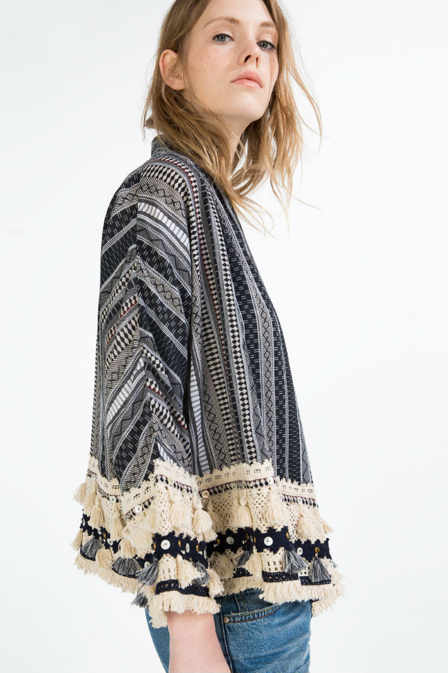 Zara vuelve a confiar en el famoso kimono que se convirtió en una verdadera plaga. En esta ocasión renueva la prenda con otros colores y prints, empleando el nude y el negro como la mejor baza para lucir una prenda exterior perfecta.