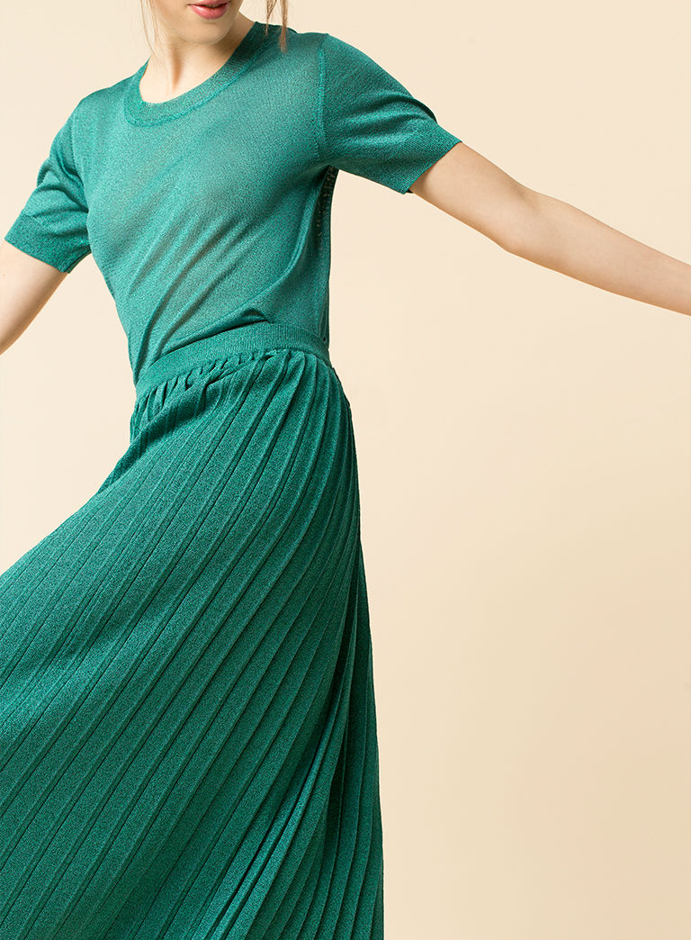 Los tejidos brillantes van a dar mucho juego durante las próximos meses gracias a las novedades de la marca del grupo Inditex. Su color enamora y la falda plisada le da el allure chic que buscamos para este tipo de citas.