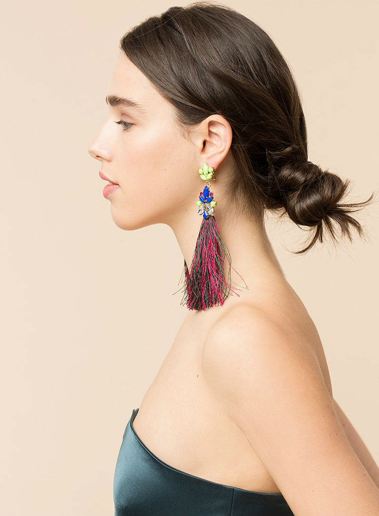 Los complementos también se adaptan a nuestros eventos importantes. Los pendientes en clave maxi se han convertido en una de las tendencias que más miradas acaparará los próximos meses. Flecos, motivos de pedrería y colores vitaminados se dan cita en este modelo de la firma para tu rostro brille con luz propia.