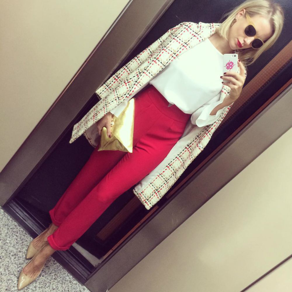 María León: Un evento formal puede ir acompañado de esta camisa Sevilla y los pantalones Doris. La sencillez del conjunto es esencial para emplear, como hace la trendsetter, un original abrigo estampado. El talle alto del pantalón unida a la sencillez de la parte superior hacen de este conjunto un perfecto combo.
