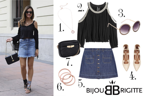 Este look de la It Girl Lady Addict lo tiene todo para triunfar: hombros descubiertos, bailarinas, falda denim, gafas de sol negras…Para un look dailywear solemos utilizar productos cómodos pero, ¿por qué no apostar por las últimas tendencias? Combina una blusa negra off-the-shoulder y adereza la prenda con una falda denim de corte A y unas bailarinas lace up. Por último, y no menos importante, juega con los complementos que mejor casen con la esencia del look. Para crear un outfit como este necesitarás los siguientes accesorios: unas gafas de sol redondas, un bolso negro, colgante minimalista y pulseras doradas de Bijou Brigitte. ¡Es hora de triunfar!