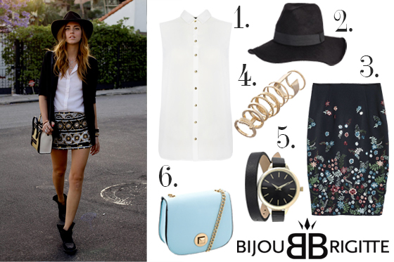 Las combinaciones de la italiana Chiara Ferragni suelen ser arriesgadas pero muy acertadas. Con este look podrás sacar tu lado más femenino, una opción que podrás lucir tanto en el día a día como en reuniones con amigas. Para copiar este look de la blogger de moda solo necesitarás una falda de motivos florales, una blusa blanca y un sombrero negro fedora de Bijou Brigitte. Emplea complementos que sean el centro de todas las miradas, nuestra lista cuenta con un bolso en color azul celeste, anillos dorados y un reloj con doble correa. ¿Qué te parece el mix que hemos creado?