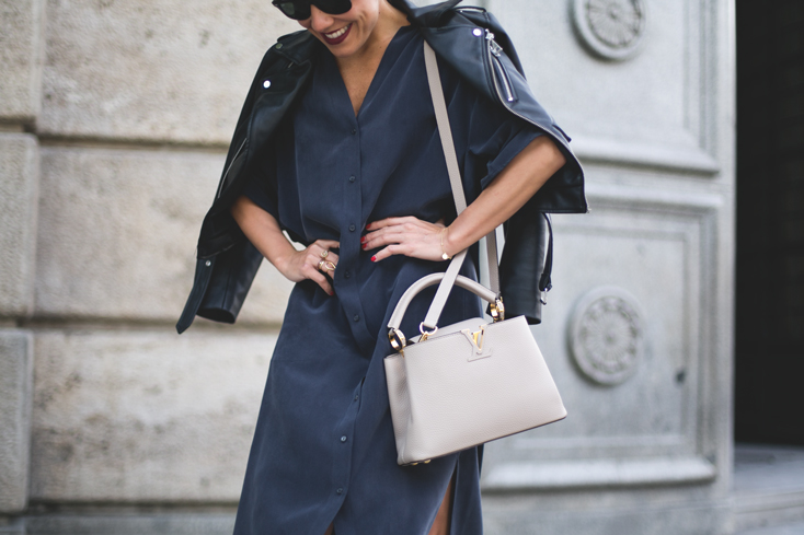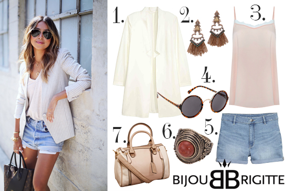 La It Girl Sincerely Jules, una de las bloggers con más reconocimiento, nos muestra uno de sus looks más casual pero efectivos para una jornada laboral. Conviértete en la perfecta working girl con un outfit compuesto por prendas básicas pero con un toque chic. Combina una elegante blazer de color blanco con un top lencero y unos shorts en tejido vaquero. Como complementos estrella del estilismo, opta por unas gafas de sol con montura redonda en carey de Bijou Brigitte para una mirada cool. Como ya hemos comentado en más de una ocasión, los accesorios son capaces de reinventar un look como este, por eso hemos seleccionado unos pendientes y anillos de Bijou Brigitte y un It Bag de lo más trendy.