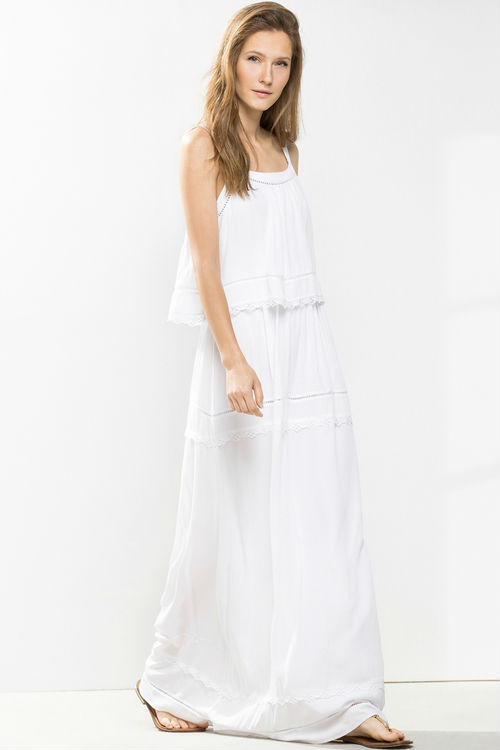 Vestido largo fluido de tirantes, con doble capa y detalle de puntilla. Si buscas un estilismo inspirado en el estilo Boho Chic esta será tu mejor opción (49’99€)