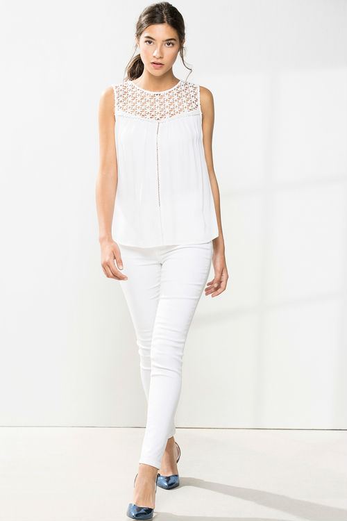 Top sin mangas con detalle de pechera en guipur y cinta de crochet. Perfecto para crear un total look como este de la marca (29’99€)