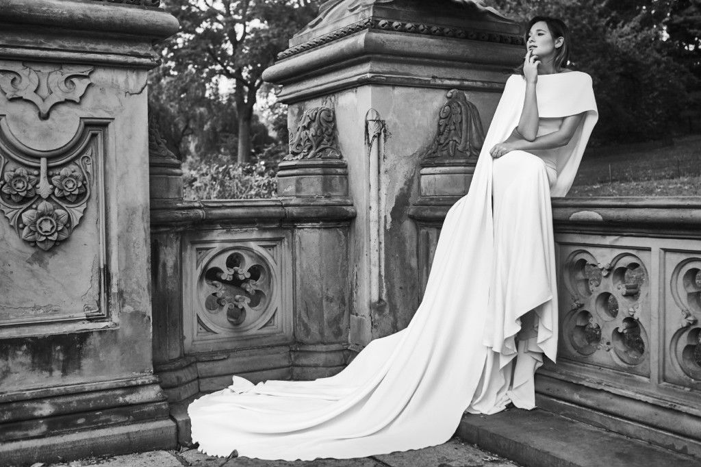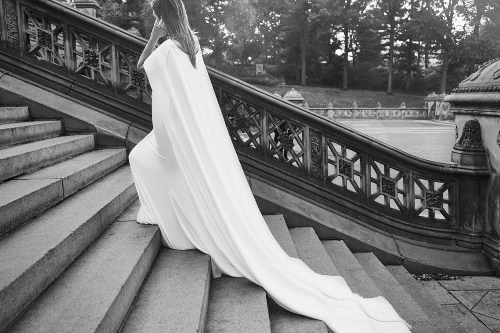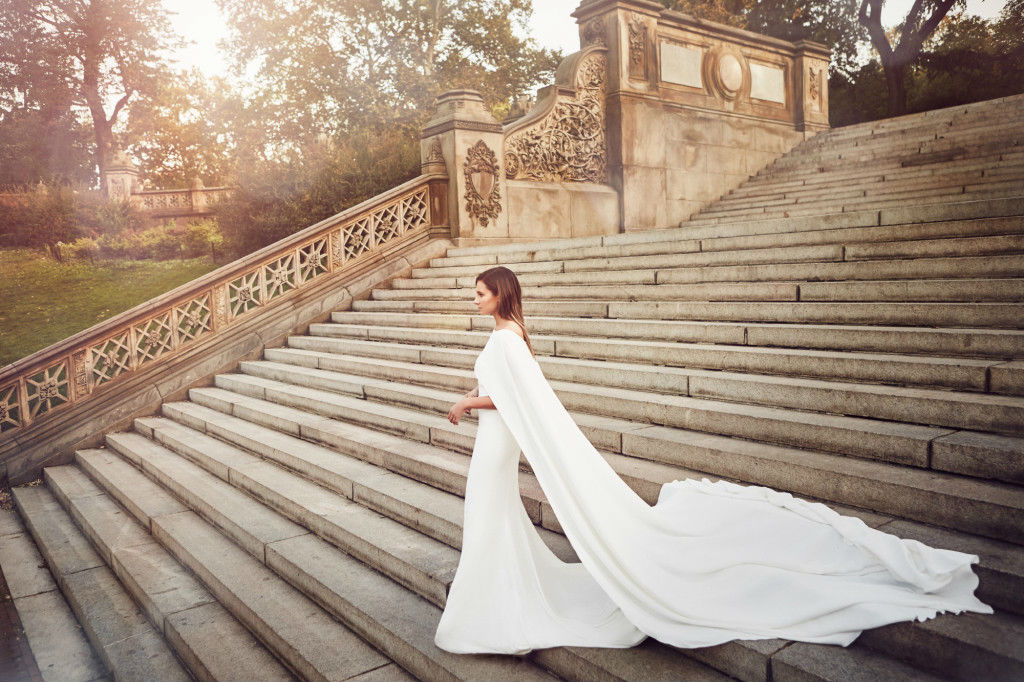 En segundo lugar se encuentra el vestido Verona, también de la colección Atelier Pronovias, elaborado a mano en el taller de la firma en Barcelona. La característica principal del look es sin ninguna duda la capa, un complemento ideal para un enlace que se lleve a cabo en otoño o invierno.