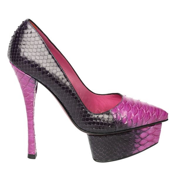 Una vez más, el clásico pumps sin plataforma siempre es un básico indispensable cada temporad, podemos encontrarlo en nuevos materiales como charol en degradé o pitón en tono fucsia.