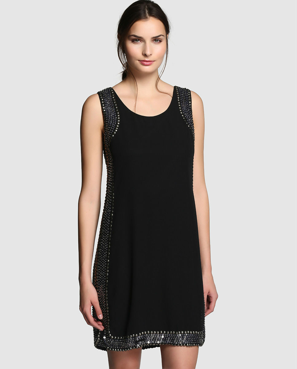 Aquí te mostramos un estilismo perfecto para esos eventos importantes que ocupan los próximos meses. Tanto la cintura como las mangas abiertas cuentan con pequeñas pinceldas de blanco, mientras que el resto del vestido se cubre del negro más impoluto. Nos encanta el resultado de combinar este vestido con un clutch de mano en plateado, la mejor forma de resaltar todo el conjunto.