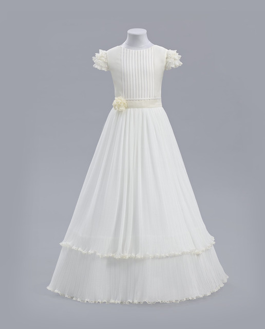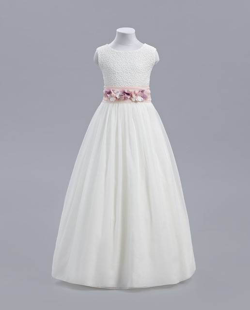 Vestido de comunión Tizzas modelo Selena. Vestido en blanco sin mangas, con cuerpo bordado y falda de capa acompañado con fajín rosa de flores y lazo trasero. Vestido ideal para una niña coqueta que se sentirá una princesa con él.