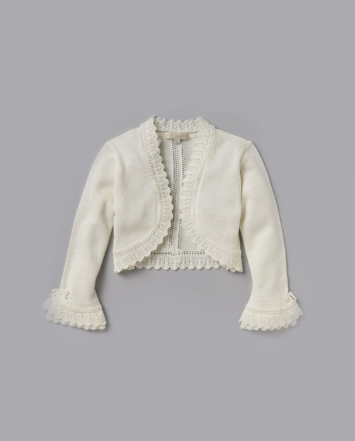 Torera de Tizzas. Chaqueta en tricot en color crema, de manga larga y volante en los bordes y puntos. Las toreras son un básico en el traje de comunión de una niña para el momento de la iglesia y esta es una buena elección disponible en diferentes colores para combinar con el vestido que mejor se adecue.