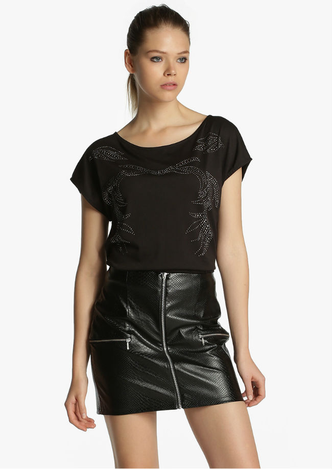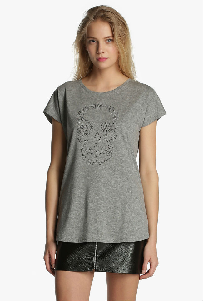 Puedes combinar tu falda de cuero con esta camiseta con estampado de calavera. Le darás a tu estilismo un aire rockero y chic.