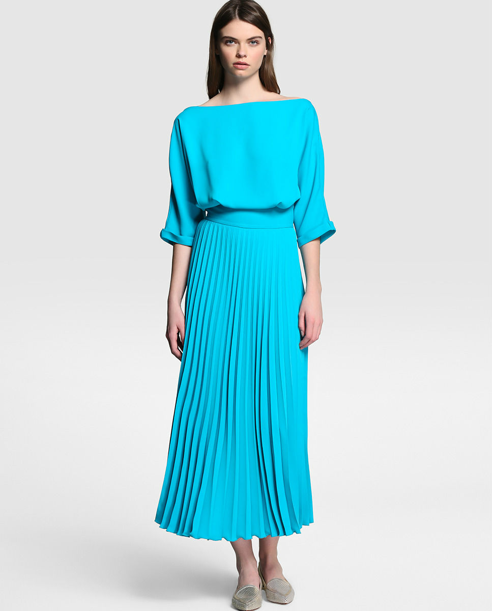 Este diseño se ajusta más a las anteriores colecciones de Elogy colección Juanjo Oliva, ya que su parte superior apuesta por los toques oversize. Su color y el plisado de la falda midi proporcionarán sensualidad a un vestido que, pese a no enseñar demasiado, es femenino hasta decir basta.