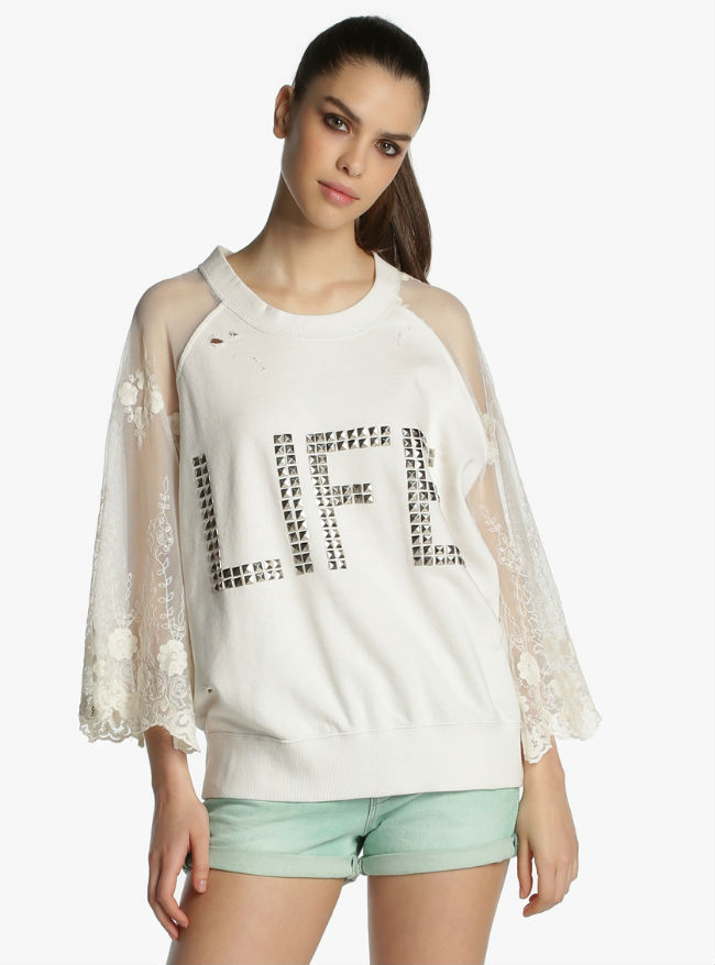 Estamos acostumbradas a ver las típicas sudaderas, esta consigue salir de “lo normal” con sus mangas murciélago, transparencias y tachuelas. ¿Te gusta?