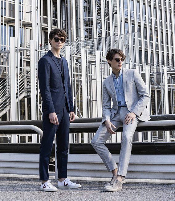 Look 7: Izq. Camiseta azul básica 5.99€, pantalón traje slim 39.99€ y americana slim 79.99€, todo de Easy Wear y zapatillas 75€ de Veja. Dch. Camisa vaquera skinny 29.99€, pantalón slim gris 49.99€ y americana slim gris 99.99€, todo de Easy Wear y zapatillas 69,99€ de Fórmula Joven.