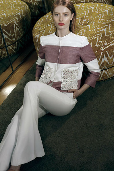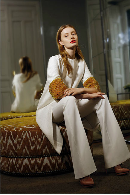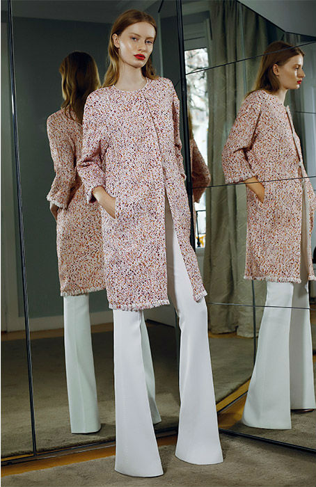 Los conjuntos formados por pantalones palazzo y abrigos de corte largo se convierten en parte de nuestros estilismos más elegantes. El diseñador consigue representar la feminidad y sofisticación a través de colores pulcros mezclados con otros más llamativos, amplios cortes y tejidos de tweed o bordados.