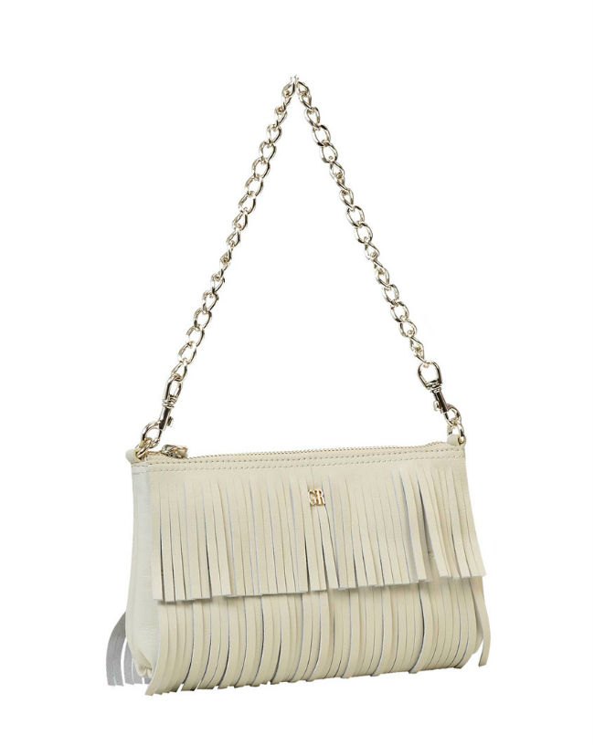 Los flecos alegran este bolso en tono crudo de bandolera.