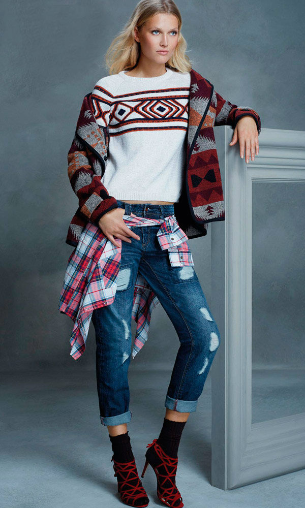 Con la firma Green Coast podrás lucir un look teen y que se adapta a las últimas tendencias. El Corte Inglés arriesga al mezclar estampados étnicos y cuadros de leñador en el mismo combo. Tanto la chaqueta como el jersey se tiñen de prints tribales en tonalidades cálidas como el burgundy o el terracotta. Unos jeans destroyed serán el acompañante perfecto para un look que marca tendencia y apuesta por la comodidad. Aunque es una moda que a nosotros no nos llama demasiado la atención, los grandes almacenes unen unos calcetines en color negro junto a unas sandalias increíbles jaula.