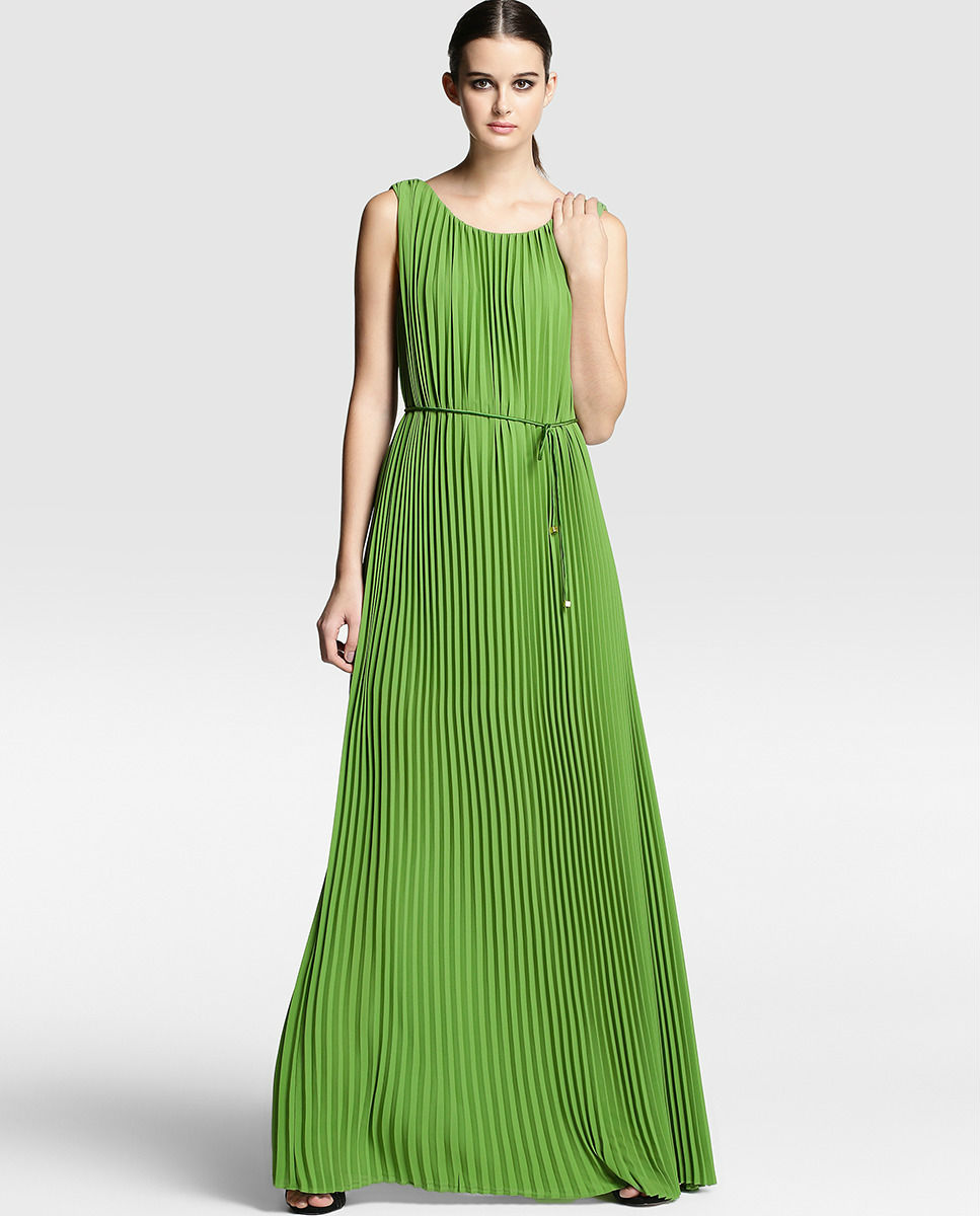 Vestido largo con trabajo plisado en color verde. Sin mangas, con escote redondo y detalle de cordón en la cintura. (49’95 euros)