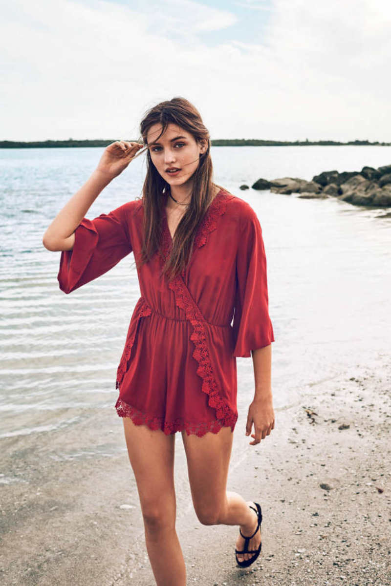 El mono es la prenda estrella de esta temporada y como tal, no podía faltar en esta colección Musa Malibú de H&M. En un tono rojo teja o marrón rojizo según se mire, este mono corto con escote cruzado y manga larga de campana, es simplemente una pasada. Combínalo con unas sandalias con cuña flat foarm en color plateado y conseguirás un look vistoso, chic y muy especial.