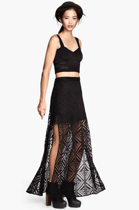 Si prefieres un look más arriesgado y llamativo, combina el mismo crop top con esta falda larga de encaje.