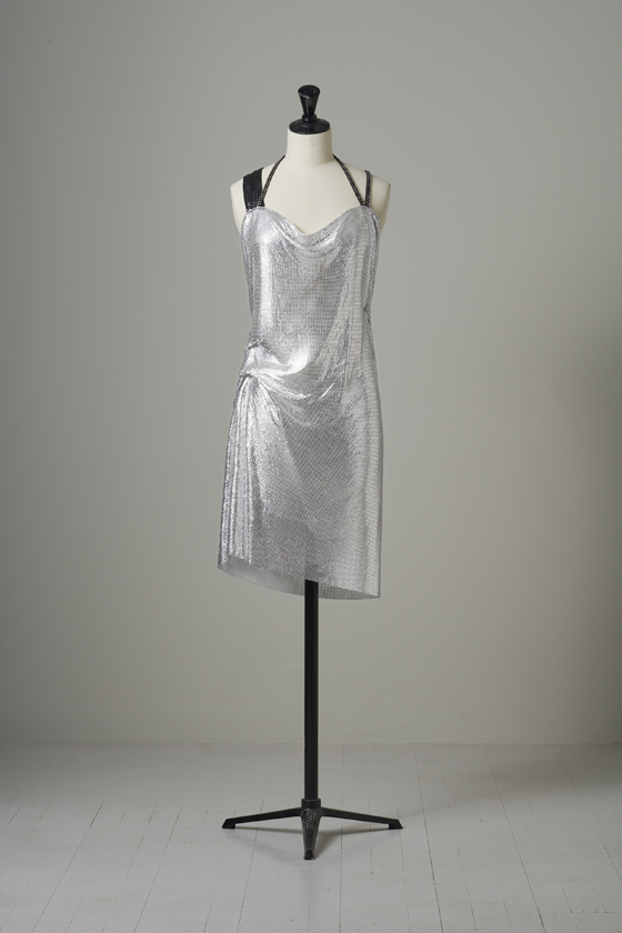 Mini-vestido metálico corto con drapeado a un lado para acentuar la cadera. Un zig-zag baja por la espalda con cuentas y cadena para mostrar la espalda abierta.