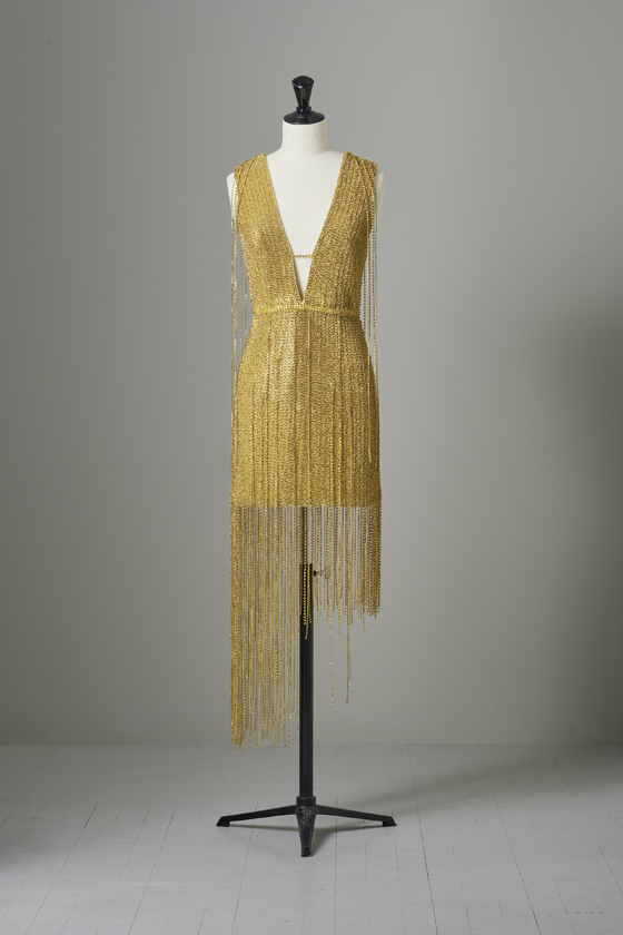 Vestido corto asimétrico bordado a mano con pedrería en dorado. Con escote frontal y en la espalda y cogido a la cintura antes de caer dramáticamente en un corte asimétrico. Las cadenas se han dejado sueltas para crear un movimiento vivaz al vestido.