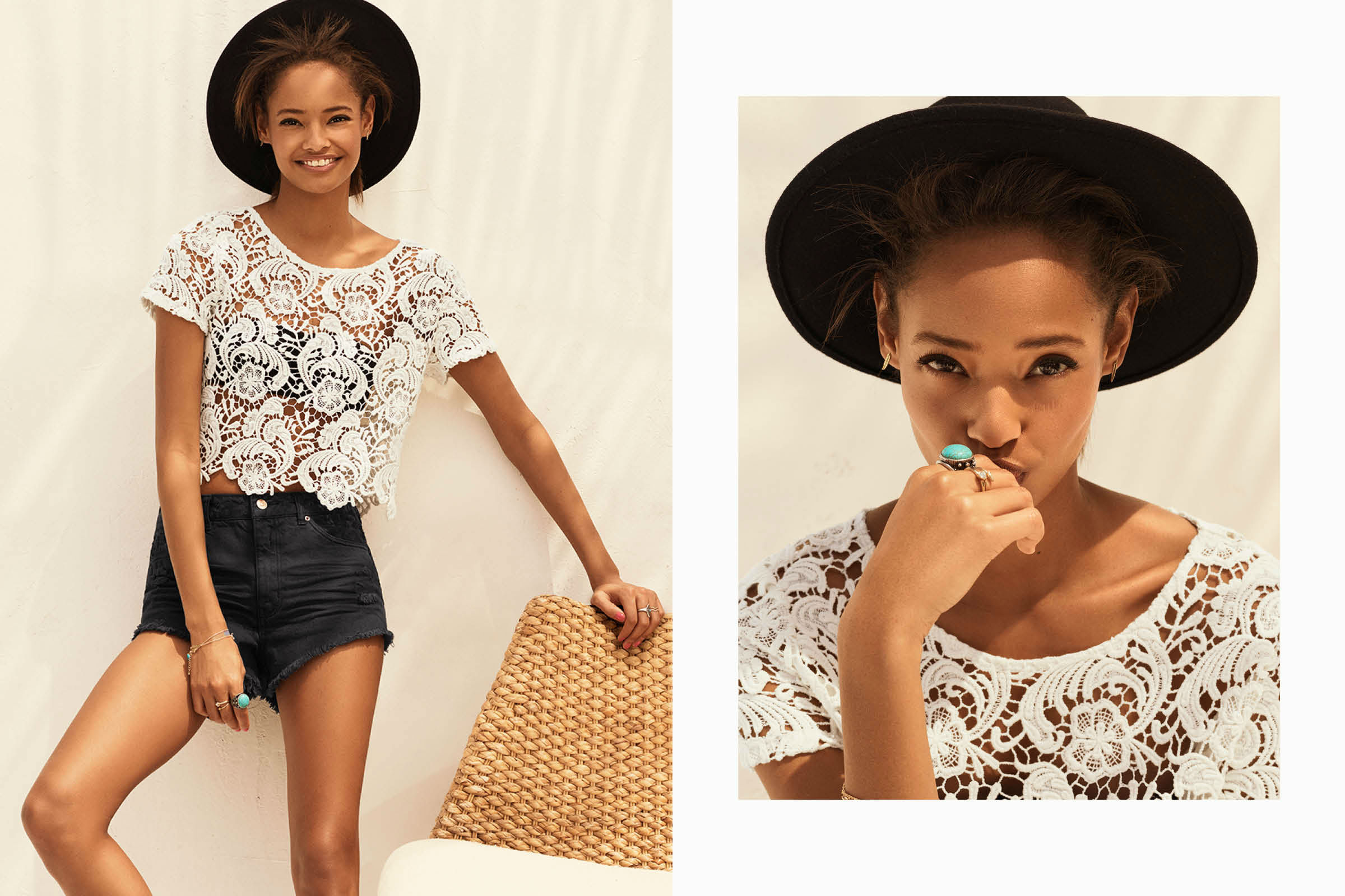 Sin duda uno de nuestros favoritos ya que interpreta la estética de los festivales de música más cool. El crop top de encaje con un short de talle alto forman un mix que podrás lucir en tus noches más relajadas del verano. Para el día elige como complemento un sombrero negro y un anillo turquesa.