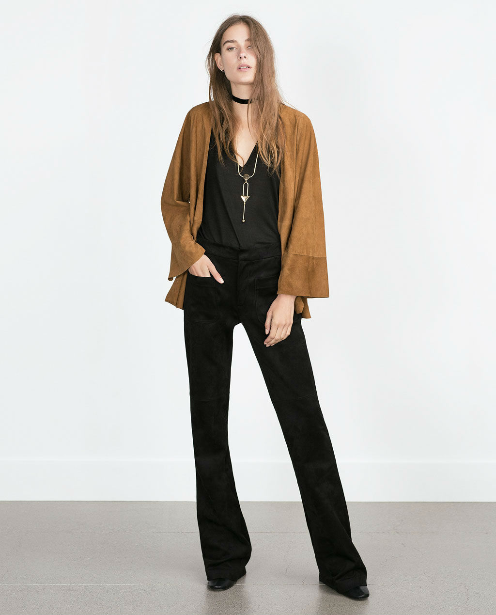 Delicadeza y pura elegancia, eso es lo que nos transmiten las novedades otoño invierno 2015 de Zara. Desde Modalia hemos elegido dos estilismos muy sencillos pero totalmente perfectos, uno compuesto por un pantalón palazzo y otro por un kimono camel de ante. Ambos productos son los que dotan a la colección de la firma con cierto toque hippie.
