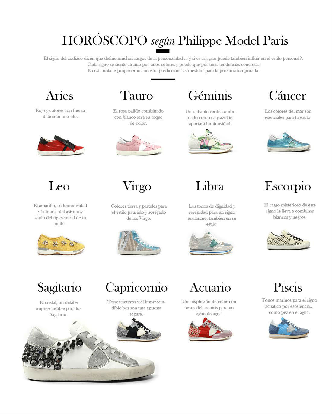 ¿Habías visto alguna vez un artículo vinculado a tu personalidad? Pues si la respuesta es no, aquí tienes una muestra. Philippe Model Paris nos enseña qué calzado de su colección casa mejor con tu forma de ser según tu signo del zodiaco. Colores, acabados, detalles y texturas están estrechamente ligados a tu estilo, echa un vistazo a este horóscopo y elige el que más vaya contigo para la próxima temporada.