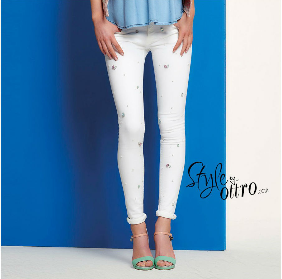 En nuestro fondo de armario solo había un color para los jeans, el azul. Desde hace unas temporadas otras tonalidades están acaparando todas las miradas. Es el caso del color blanco, que destaca aún más si cabe a través de las aplicaciones joya que incluye en la parte delantera.