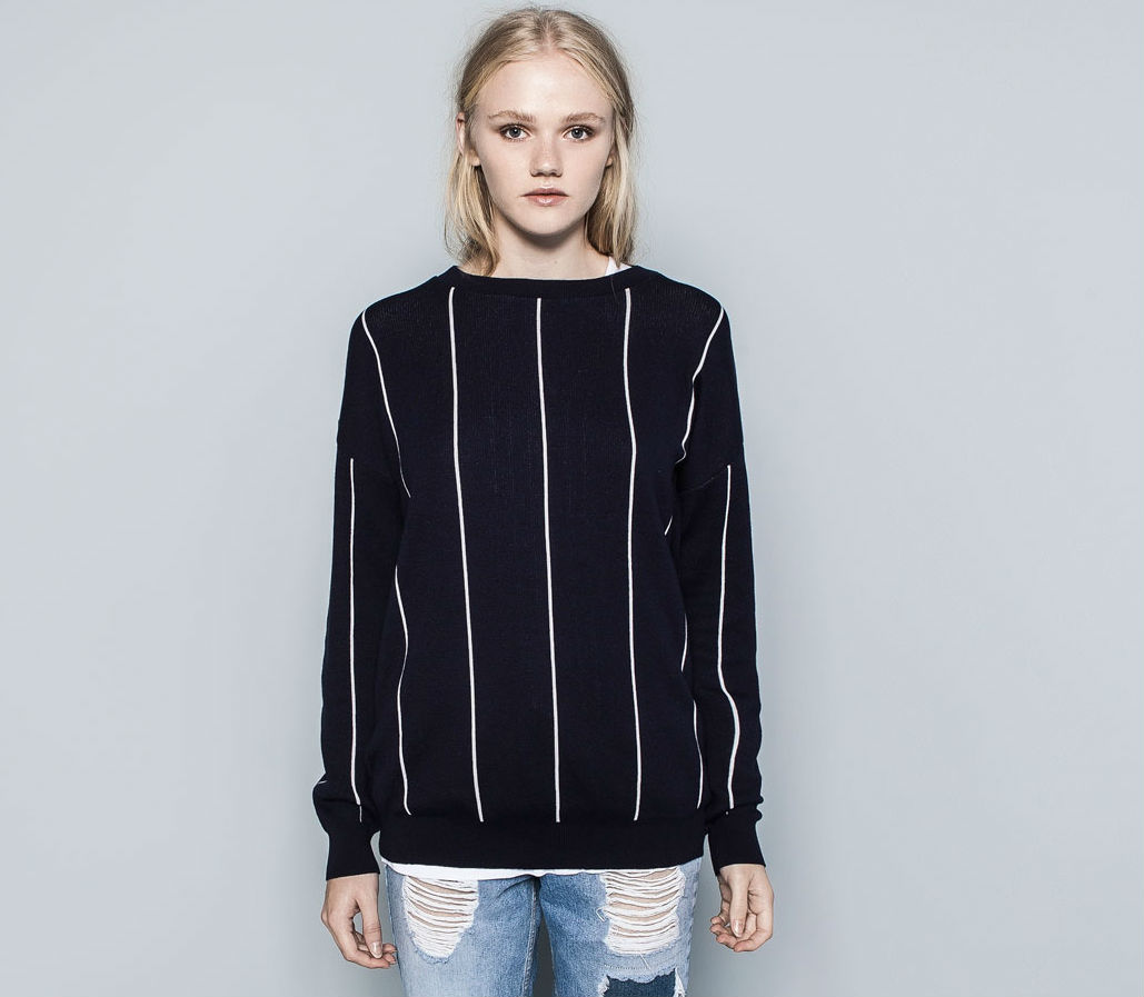 Las rayas diplomáticas abandonan los trajes de chaqueta para plasmarse en un jersey neutro pero siempre infalible.