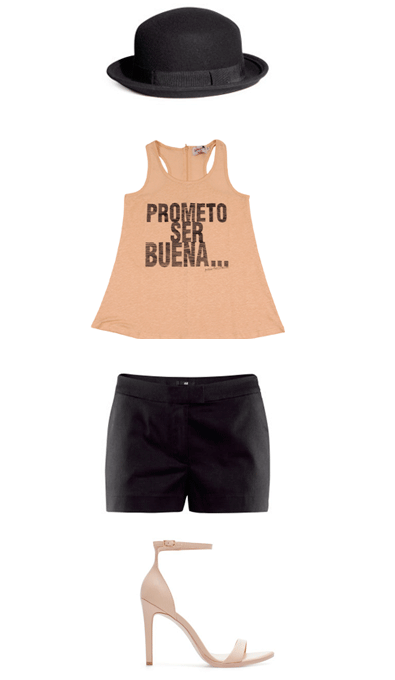 Nosotros te proponemos este look elegante e informal con la camiseta «prometo ser buena» de Dolores Promesas, estos shorts de H&M y estas sandalias con tacón de Zara. Aporta un toque chic con el sombrero de H&M. A triunfar!