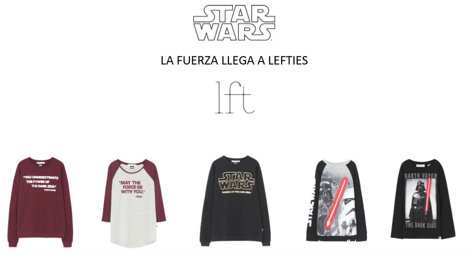 Lefties, una de las firmas low cost por excelencia, se suma a la lista de marcas que se han inspirado en la mítica saga. Esta temporada luce tu mejor look casual gracias a estas camisetas y sudaderas, productos ideales para combinar con jeans skinny fit e incluso faldas de efecto cuero.