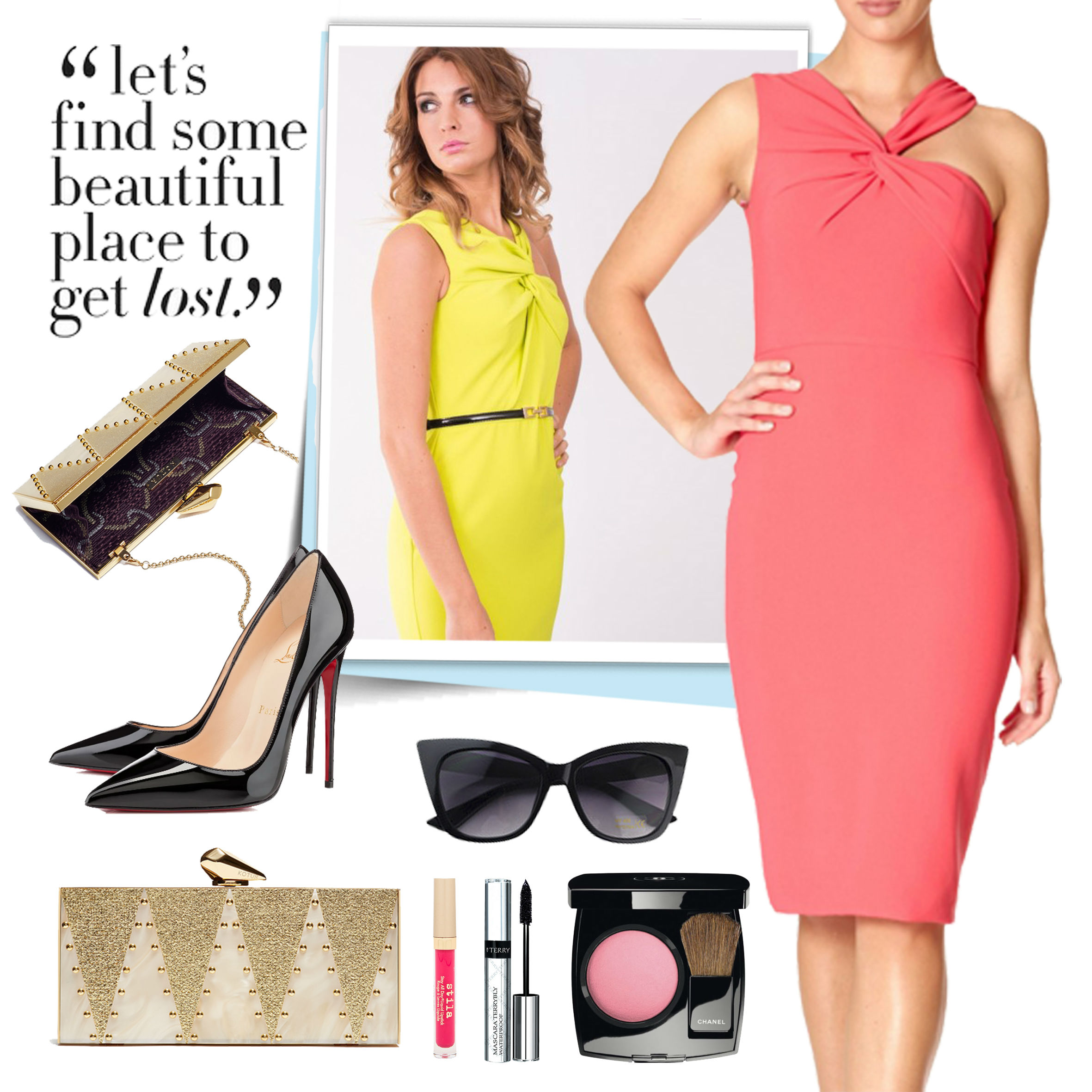 La primavera altera nuestro armario con colores vitaminados, esos que tanto favorecen a todo tipo de pieles y que serán nuestros mejores aliados a lo largo de estos meses. El color fucsia tiñe este modelo con uno de los cortes más divertidos del momento. Tanto el escote asimétrico delantero como el trasero van a ser los causantes de más de una mirada por parte del resto de asistentes. Para rematar el look hemos escogido diferentes accesorios que casarán a la perfección con el vestido: unas gafas de sol cat-eye y unos stilettos de charol en color negro, un clutch joya rectangular con detalles gold y un make-up muy sutil en tonos rosados.
