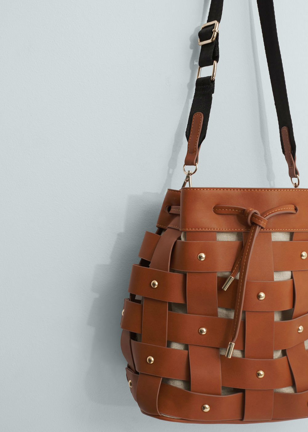 Otro it bag que se caracteriza por su originalidad es este modelo en forma de saco y entramado en camel. Las tachuelas doradas sriven de adorno cool y casual, además cuenta con dos asas para que lo lleves como más te guste.