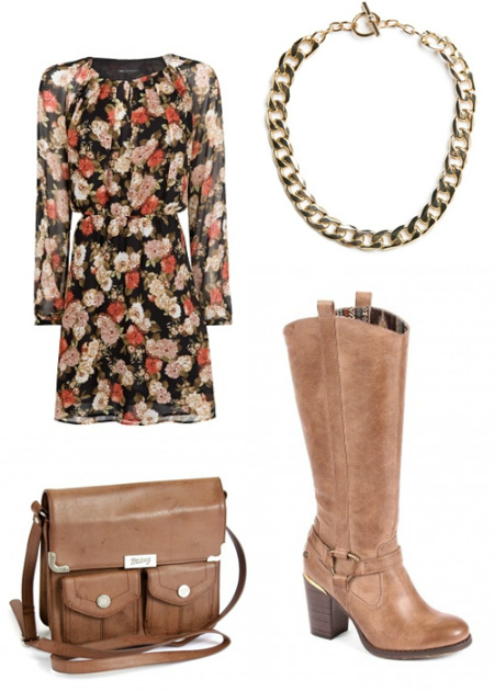 Para esas tardes, nos inspiramos en un outfit con toques románticos, mezclando un vestido con estampado floral de Mango y unas botas de tacón ancho en tono marrón de Mustang.