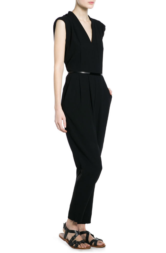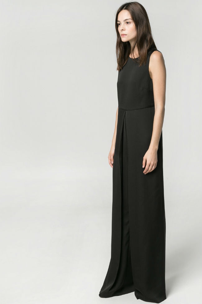 Una alternativa diferente es este mono negro estilo palazzo. El ancho de los bajos te dará una gran soltura y elegancia, aportando sensualidad a tu outfit. Con un cinturón fino conseguirás acentuar tu figura y con unos buenos tacones parecerás todo una celebridad.