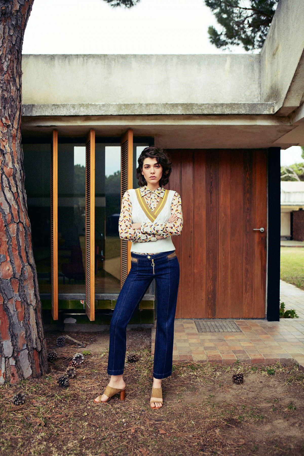 Este es uno de los estilismos más retro de la colección, compuesto por unos jeans de tiro alto, una camisa de estampado vintage y un chaleco al más puro estilo americano. ¿Te atreves a lucirlo este otoño?
