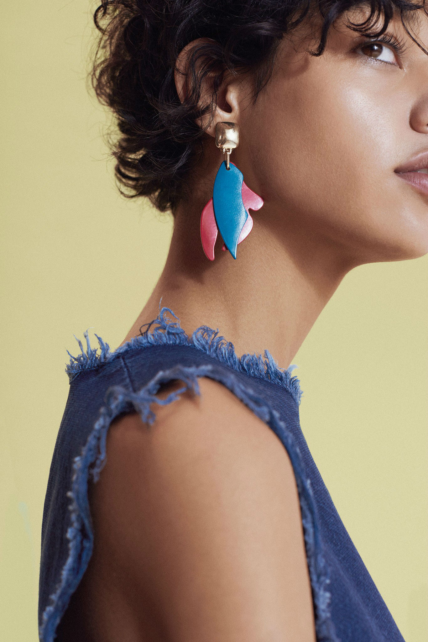 Tampoco faltan los accesoiros más originales de la temporada. En esta caso son dos modelos de pendientes que se caracterizan por su forma e intensidad, piezas que combinan con pequeños elementos dorados y que darán luz a los conjuntos que lleves.