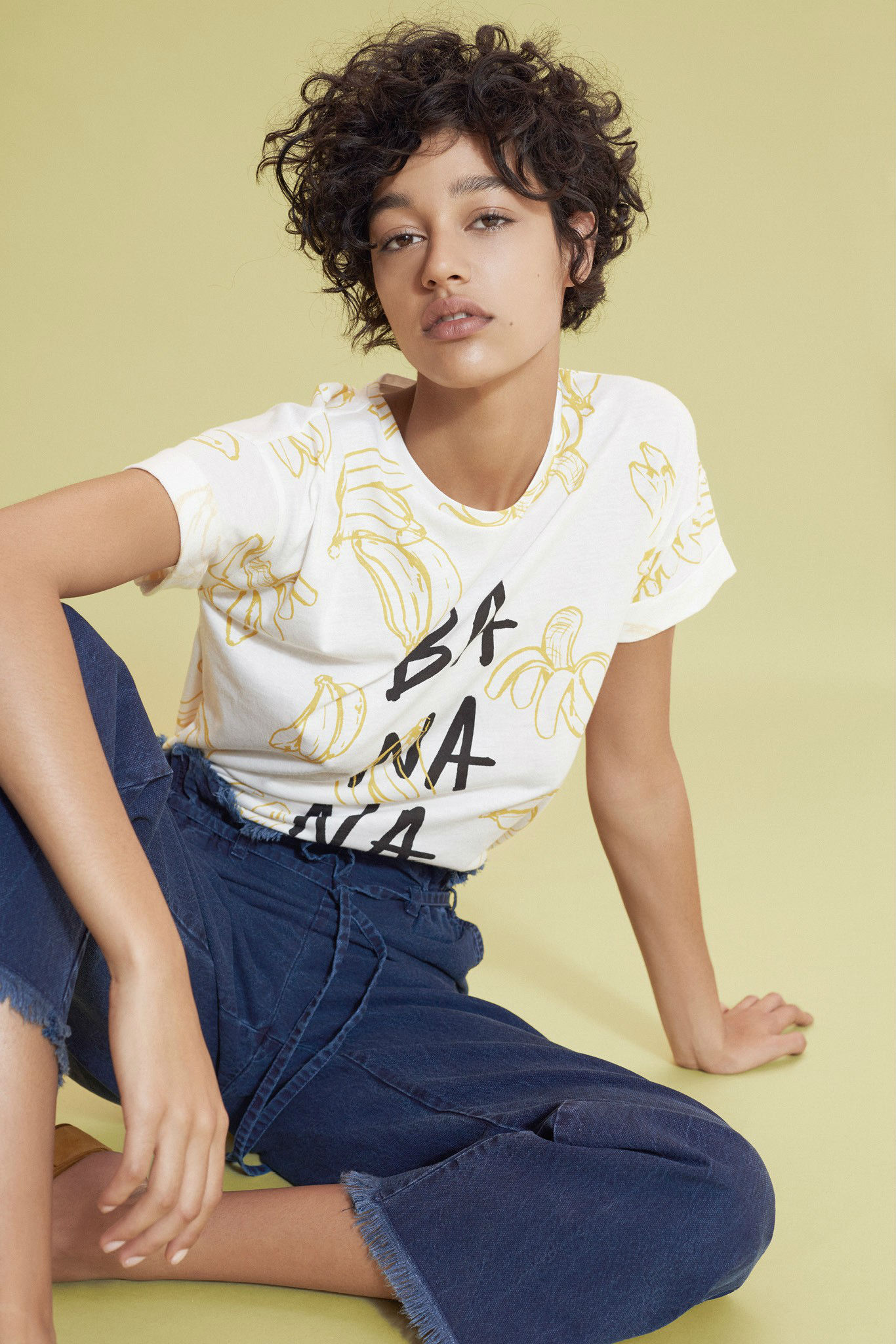 Las camisetas básicas se adaptan a la colección Tropicalia de Mango mediante mensajes y motivos frutales. Aquí está la muestra, una t-shirt con bananas que la marca une con un pantalón denim de talle alto.